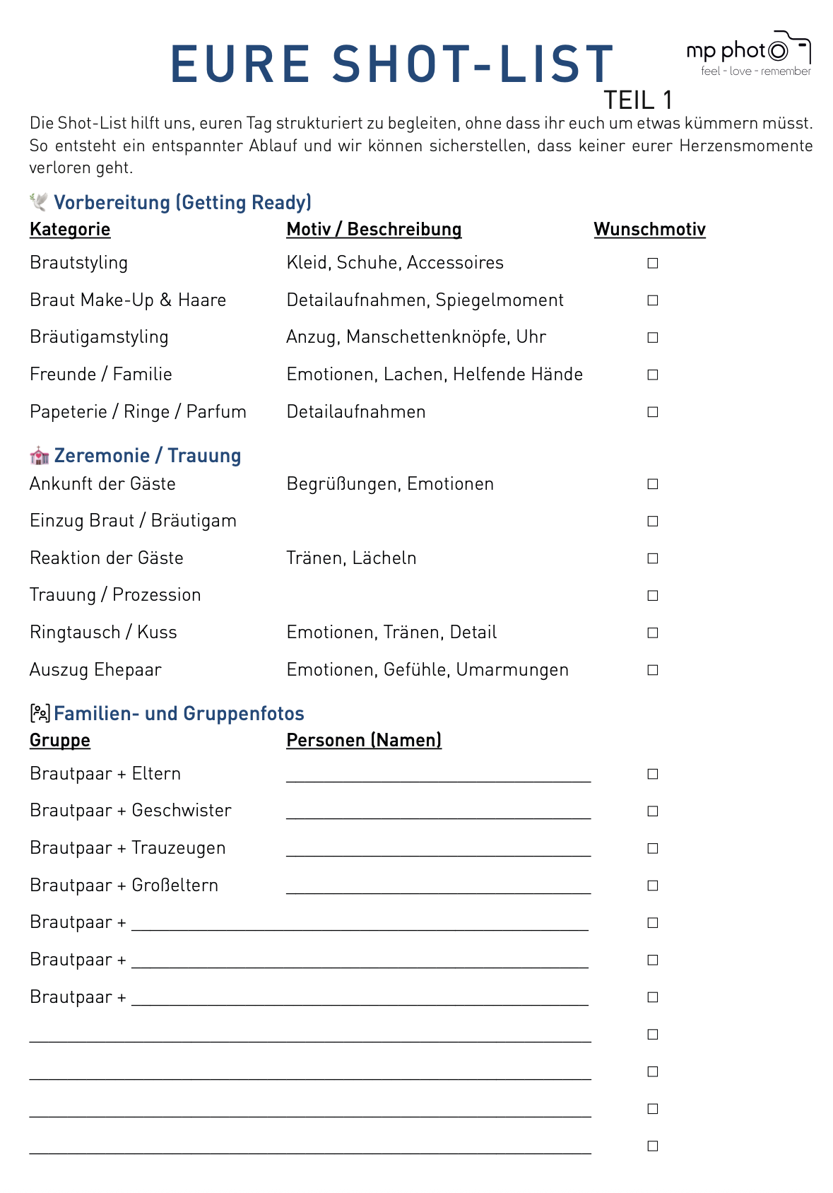 Ihr wollt sichergehen, dass auf eurer. Hochzeit niemand vergessen wird ? Dann nutzt unsere Shot-List-Vorlage.